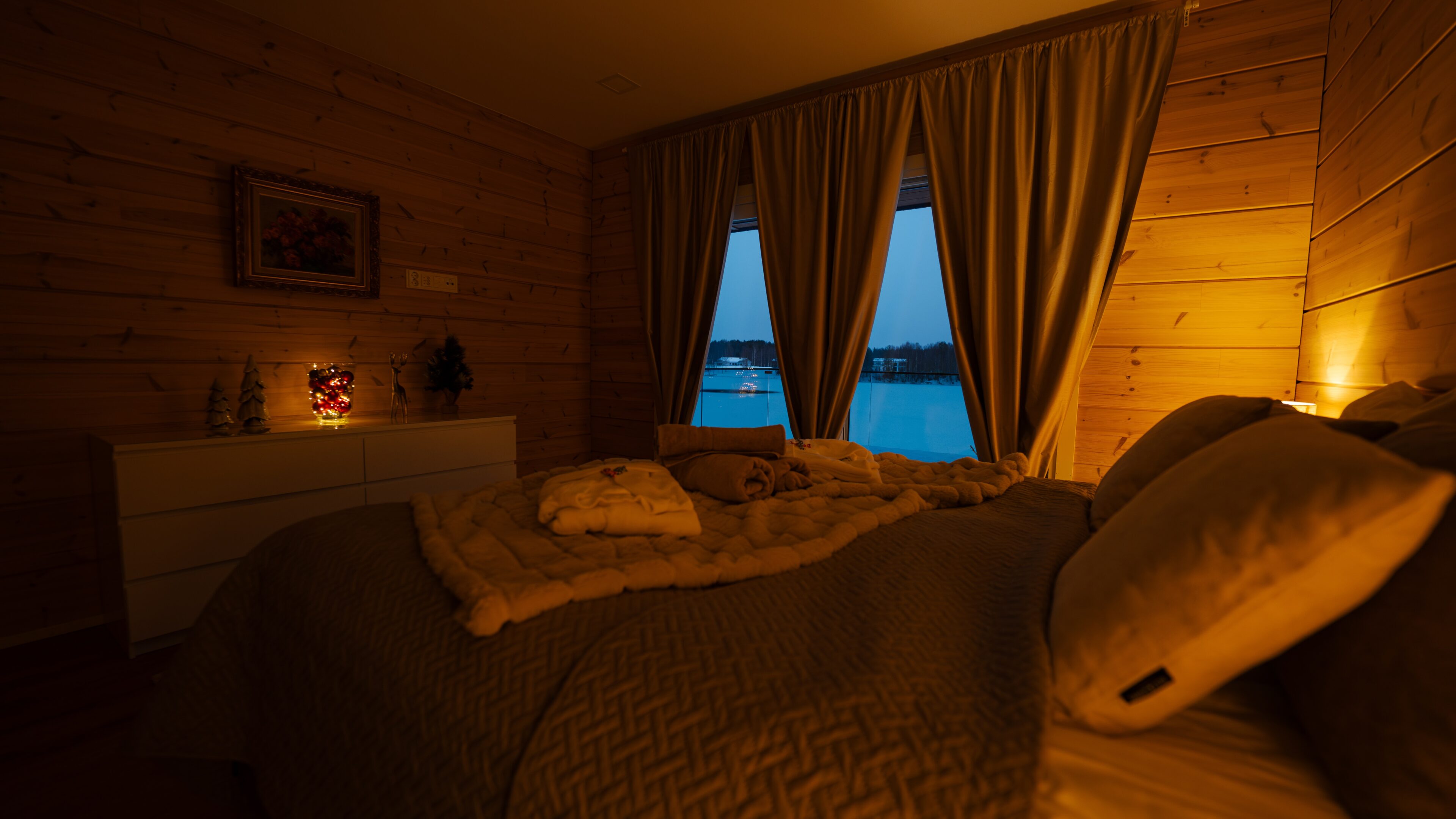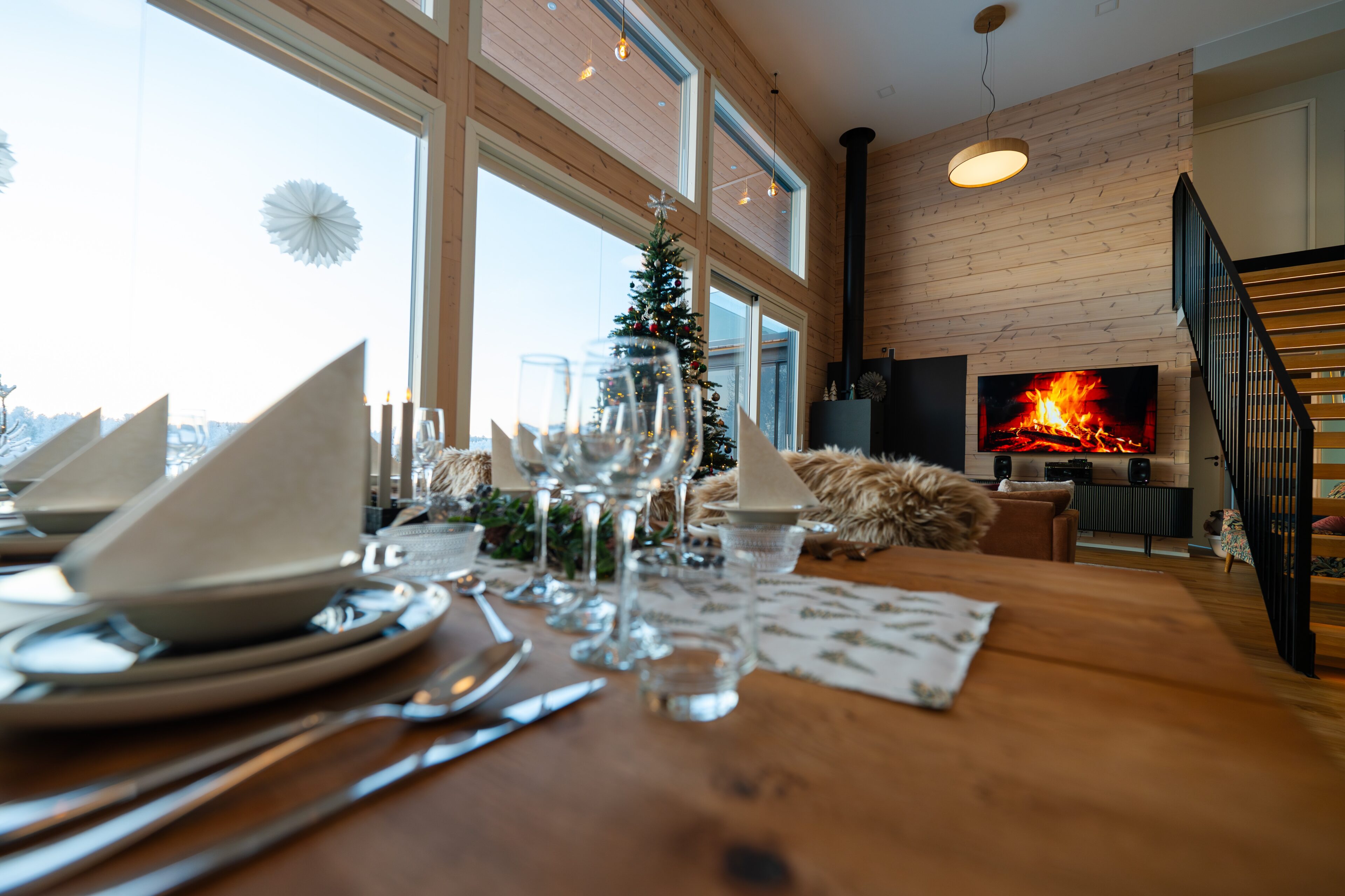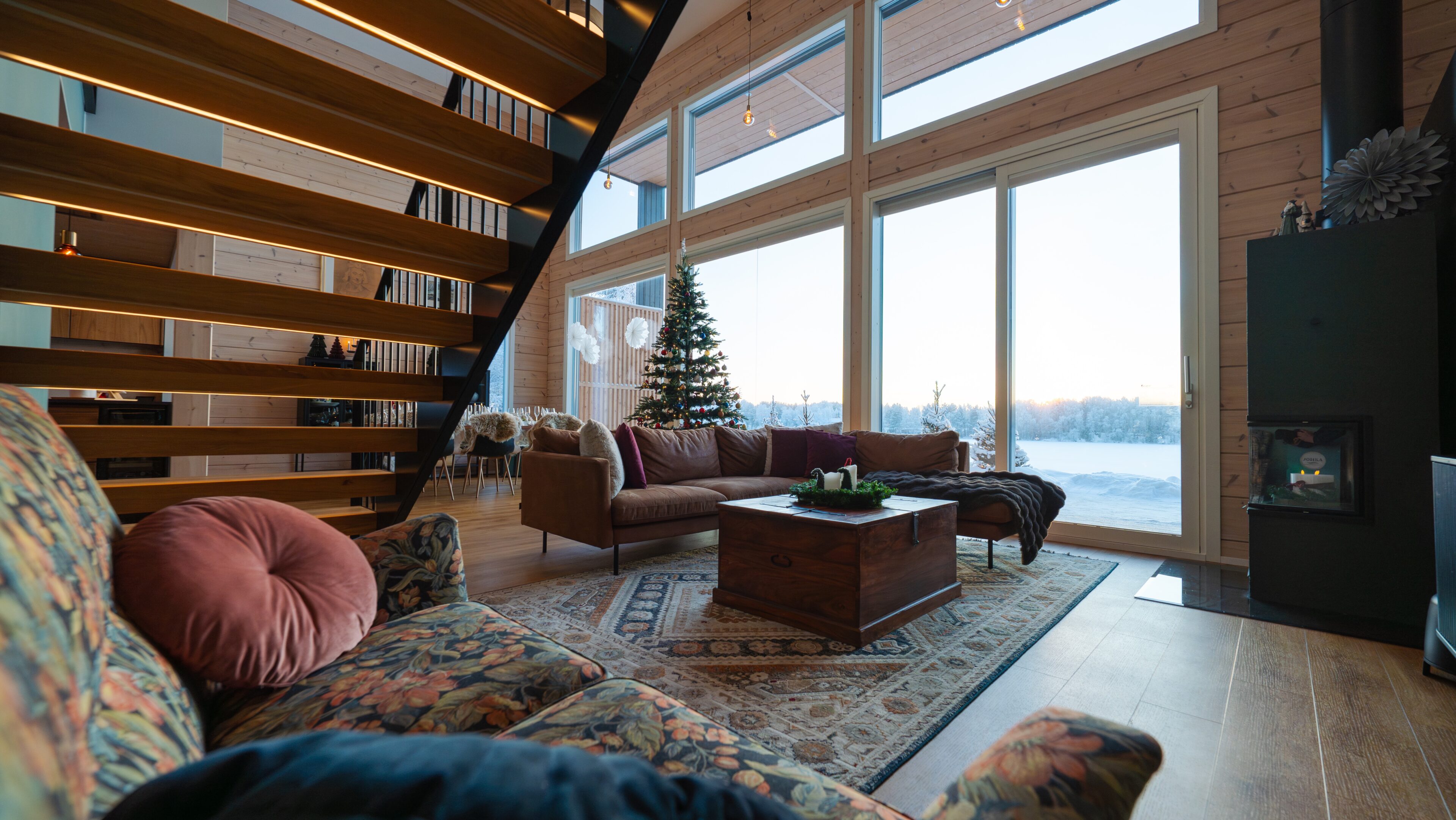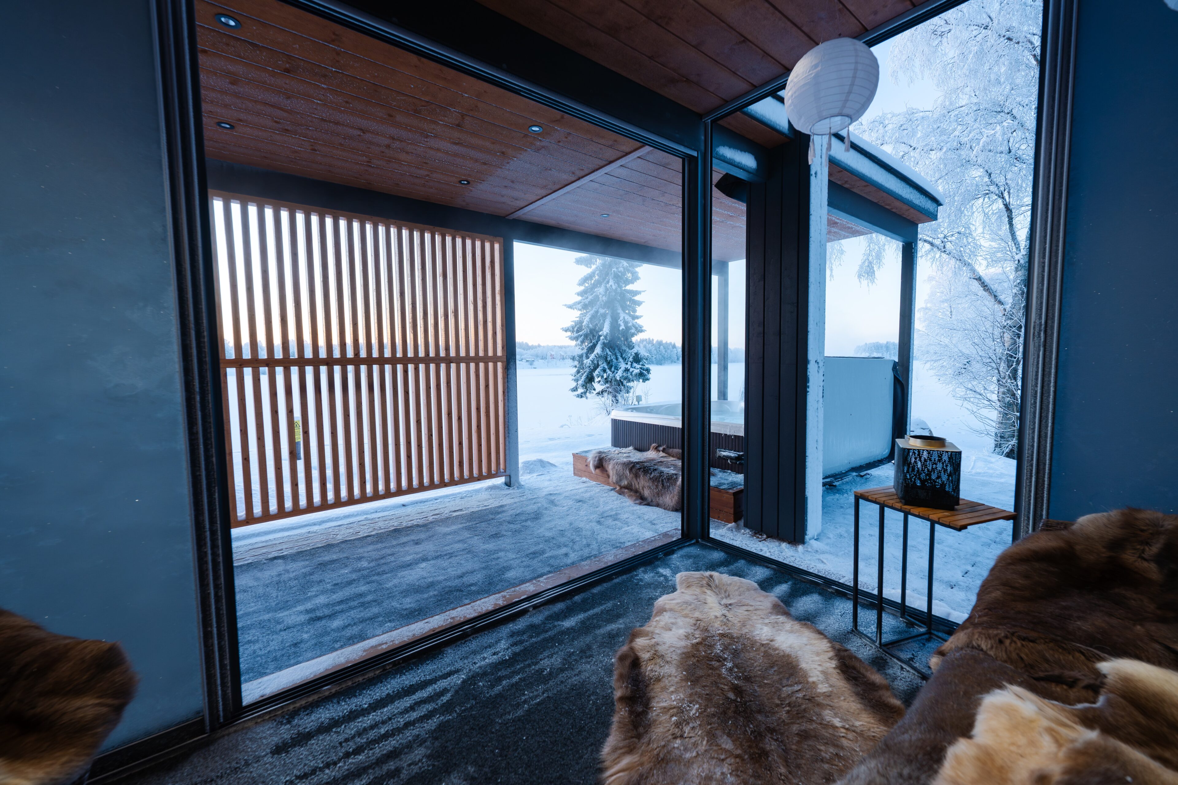 Stunning Indoor Environments: The villa’s interior blends modern luxury with rustic charm, creating a warm and inviting atmosphere. Large windows offer panoramic views of the Kemijoki river and surrounding nature, enhancing your connection to the beautiful landscape.